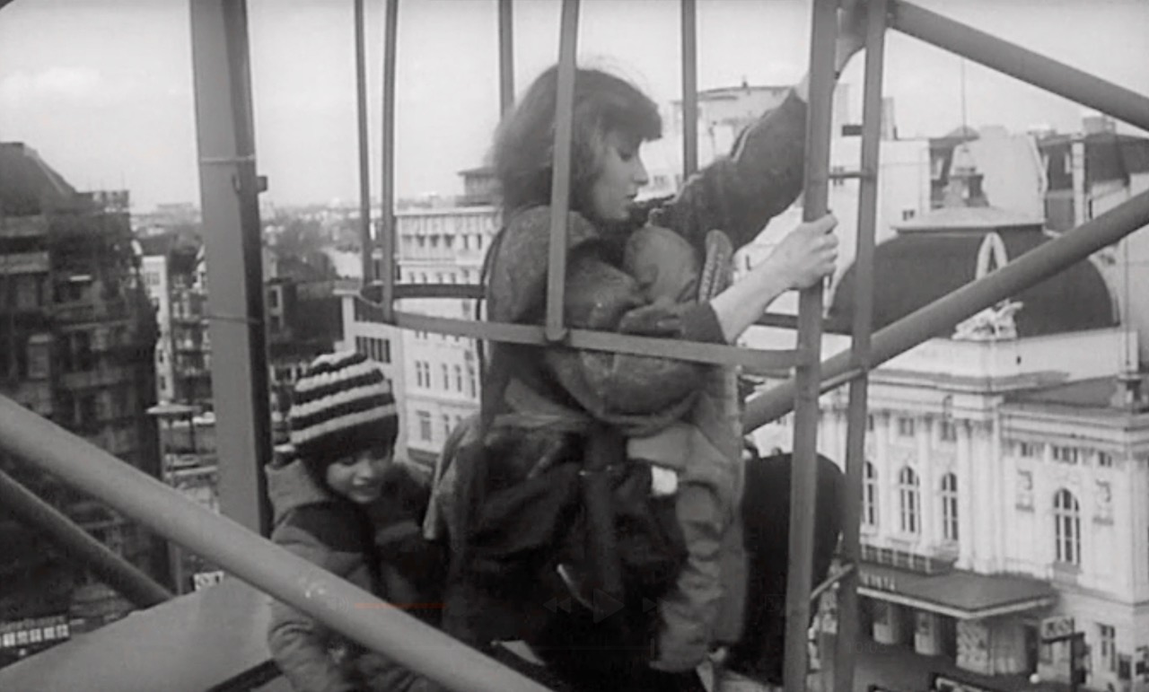 Eine Frau steigt mit zwei kleinen Kindern auf den Ausleger eines hohen Baukrans. Sie wirft Flugblätter nach unten. Sie wird ihre Gründe dafür haben. (Wer will, kann auf einem Flugblatt lesen, dass sie bis zum Abend eine Wohnung sucht.)